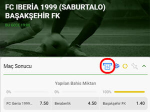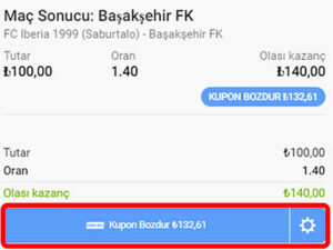 Aşağıdaki görselde ifade edildiği gibi, “Kupon Bozdur” anlamına gelen dolar sembollü banknot ikonu, ilgili bahiste bu seçeneğin var olduğu anlamına gelir.