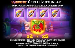 - 3 veya daha fazla Luxpots Biber Bombası Scatter sembolü elde ederek nakit ödüllerin kapısını arala. Unutma, her bir Scatter sembolü bir Ekstra Spin demek.